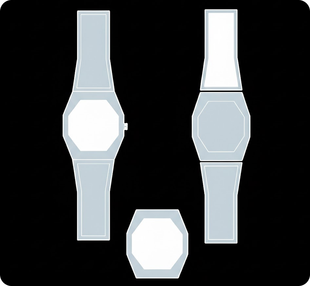 Some iterations introduced softer transitions to understand how the case fits on the wrist. Others returned to sharper edges to preserve the intended character.